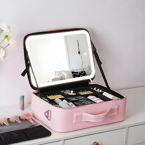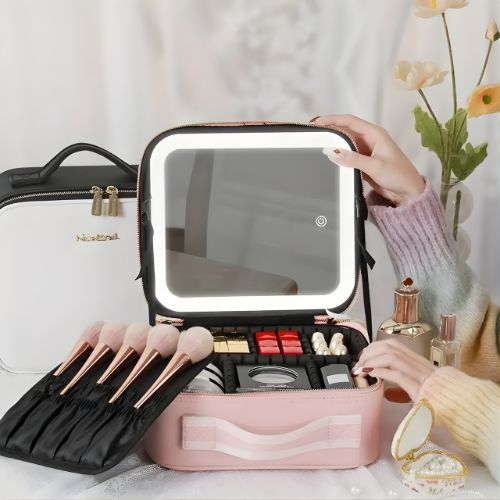 This is a GREAT makeup case with a removable LED light that you can choose between three shades and all have dimming capability between low to high brightness. The compartments are adjustable or removable. It looks very classy and there is a special insert for makeup brushes or whatever you choose to fill it with. The top is a quilted design and it has dual zippers. It is very lovely.